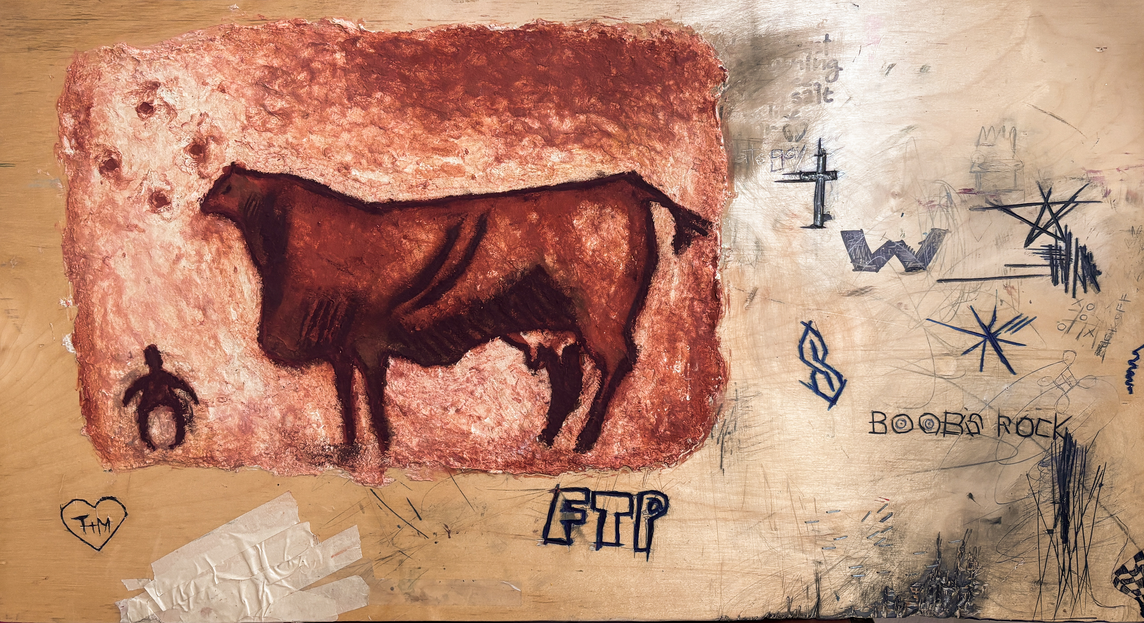 As is the case with other scatter-brained individuals, I was often more interested in doodling rather than note taking in class: particularly in math. I collected ochre from the dirt around my school and turned it into an acrylic paint, a modernized prehistoric counterpart. Through an ahistorical fusion of mediums, styles, and subjects, I try to validate my instinct to create by comparing the practice to our ancient ancestors.